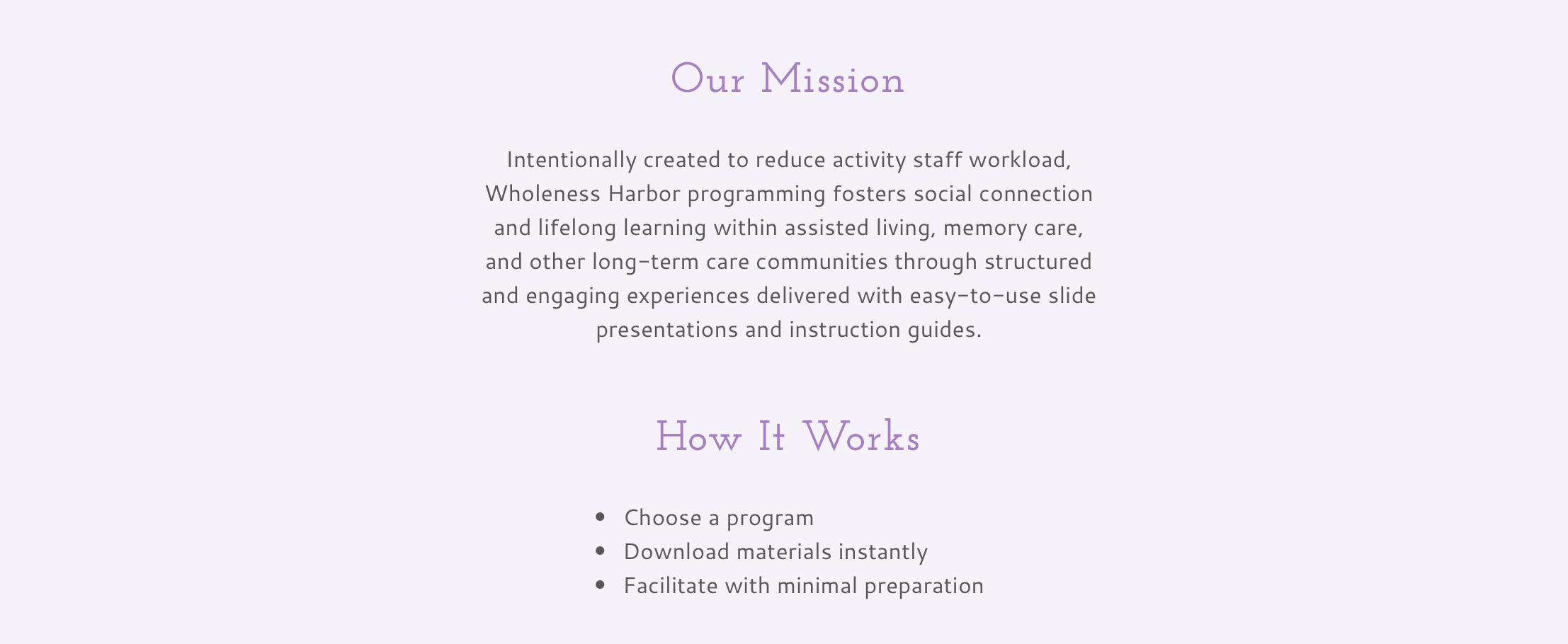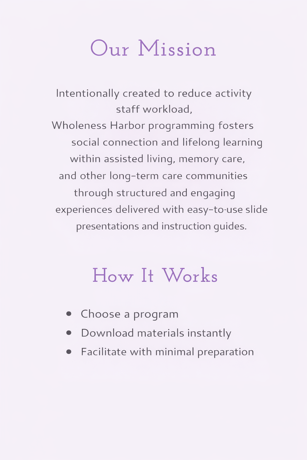Pilot testing found that Wholeness Harbor programming reduced staff workload and drove strong resident engagement, with cultural touchstone and life-review reflection activities consistently engaging residents in both memory care and non-memory care facilities.
